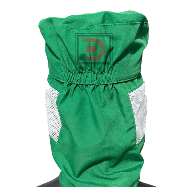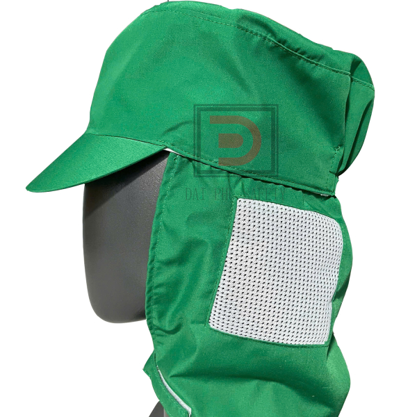 Mũ vải công nhân thủy sản, có may bọc tóc bên trong. Mũ có miếng xé dán ở cổ giúp hạn chế tóc rơi ra ngoài.