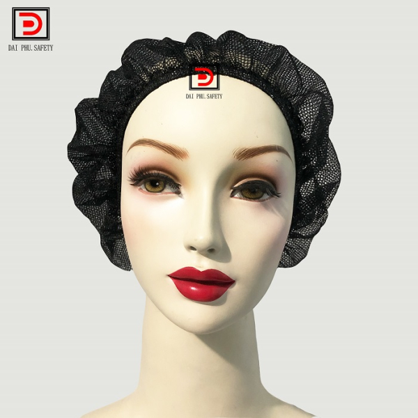• Đặc điểm: Nón lưới trùm tóc màu đen loại mỏng được may vòng thun quanh nón, công nhân dùng nón để bao tóc cho gọn gàng tránh tóc rơi rụng vào sản phẩm. Ngoài ra, nón được dùng như một loại để giúp công nhân tránh các tai nạn nghề nghiệp về tóc như bị tóc cuốn vào máy móc đang vận hành.